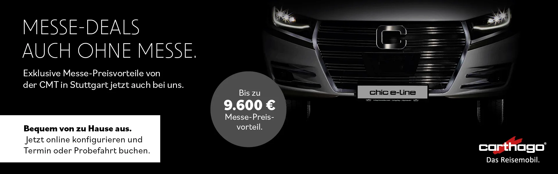 Erleben Sie während der CMT-Woche Carthago Premium-Reisemobile live bei uns vor Ort – ganz ohne Reise nach Stuttgart und mit allen CMT-Messevorteilen.